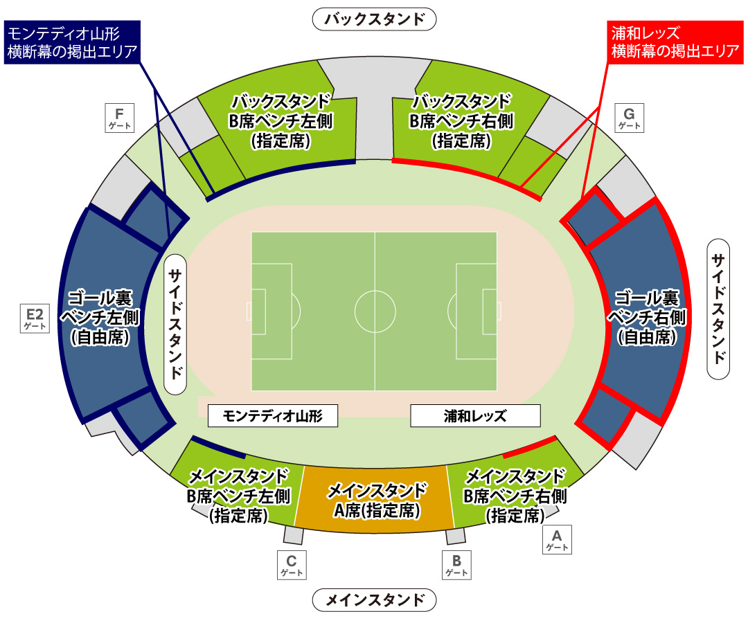 バックスタンドB席ベンチ右、ゴール裏ベンチ右は浦和レッズの応援席です。モンテディオ山形の応援(応援グッズの着用を含む)はできません。 - 入場券で指定されたエリア以外での観戦はできません。