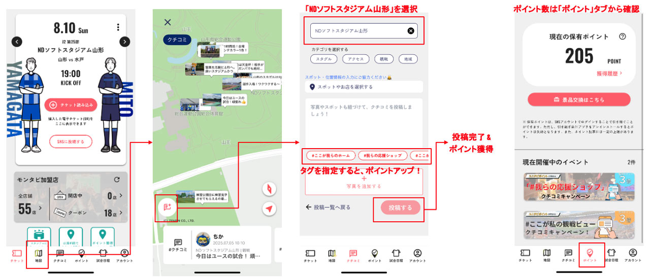 画面下部の「地図」タブ(もしくは「クチコミ」タブ)から「クチコミ投稿」ボタンを押下し、対象となるスタジアム・スポットを選択後、文章・写真を入力し、投稿する流れとなります。