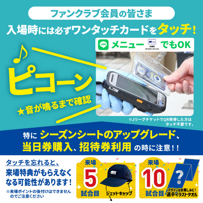ワンタッチパスをゲートにてタッチいただくかJリーグチケット上でファンクラブ会員の紐付けを行いチケットを購入したQRコードでの入場で来場ポイントを貯めることが可能です。貯めたポイントはご希望のお引換えをいただけます!