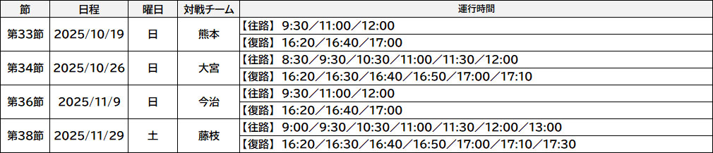 - 各試合によって運行時間が異なりますので予めご確認をお願いいたします。