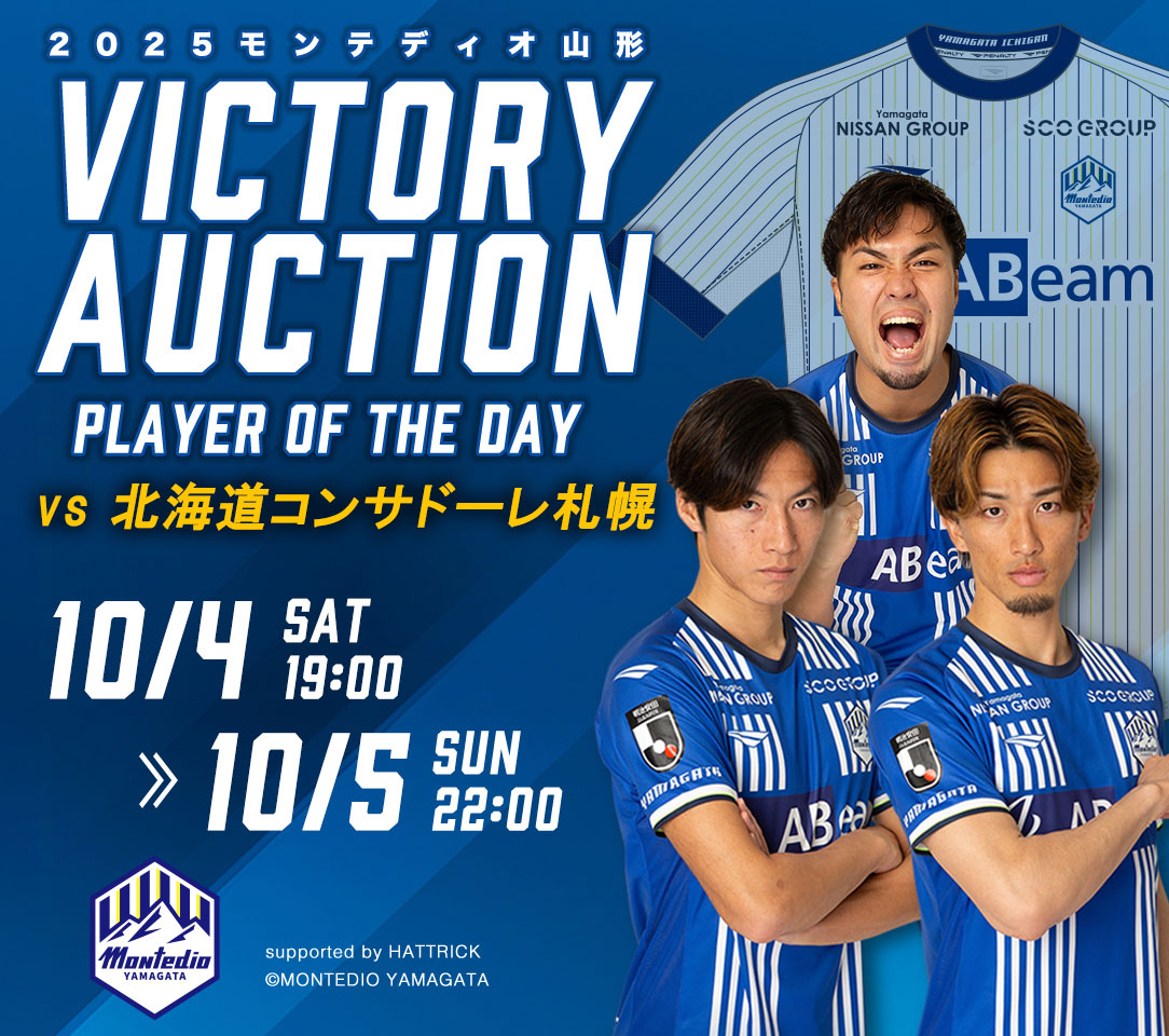 モンテディオ山形では、今季からホーム・アウェイ全試合において勝利時限定で、オークションサービスハットトリックにおいて、勝利試合後24時間限定で「VICTORY AUCTION」を開催いたします。