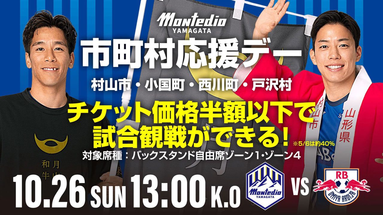 2025年10月26日(日)開催のホームゲーム RB大宮アルディージャ戦は、「村山市・西川町・小国町・戸沢村」の市町村応援デーです。