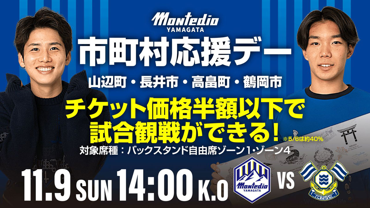 2025年11月9日(日)開催のホームゲーム FC今治戦は、「山辺町・長井市・高畠町・鶴岡市」の市町村応援デーです。
