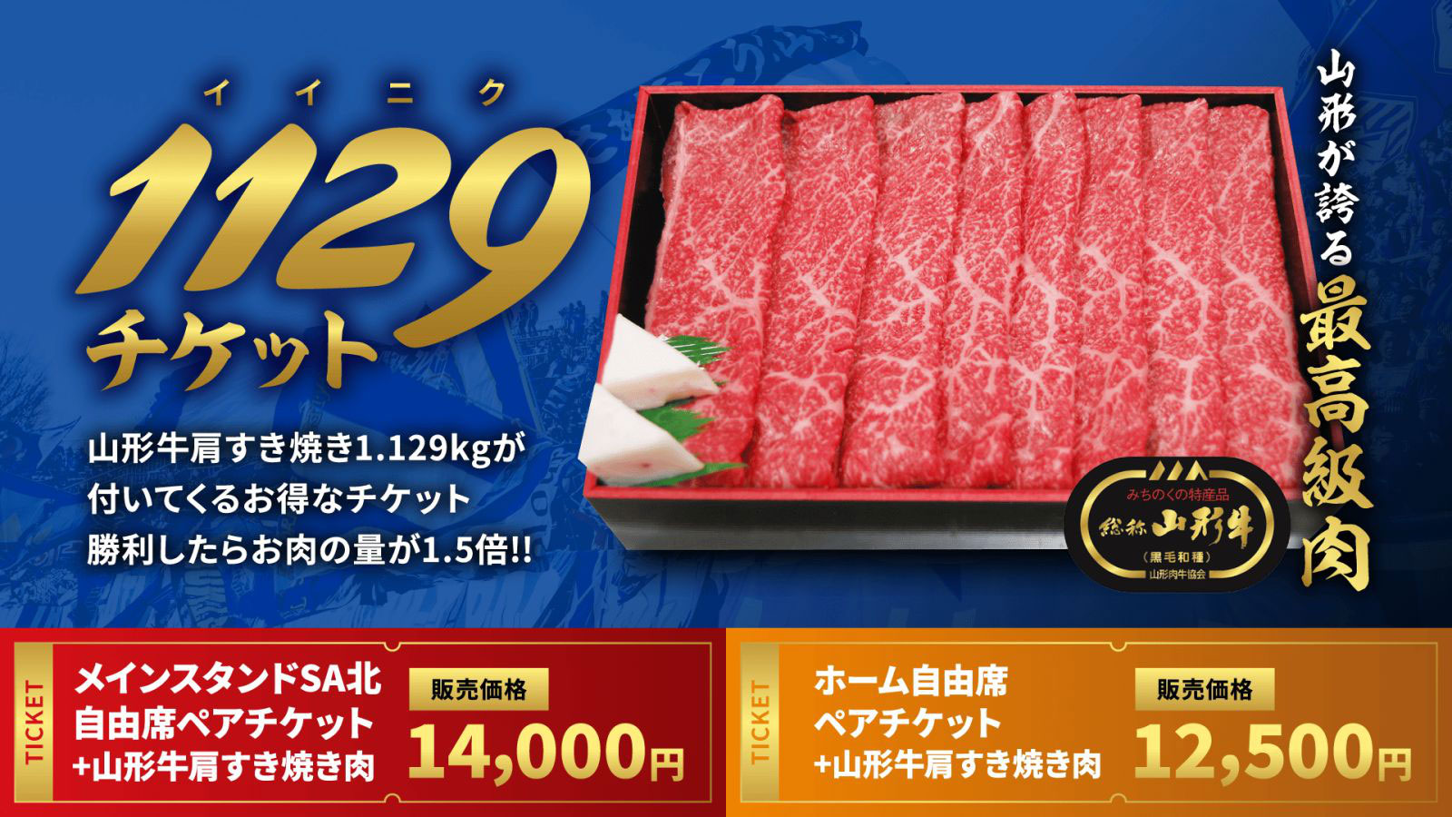 モンテディオ山形では、2025年11月29日(土)開催の藤枝MYFC戦を対象に、山形牛が付いてくる1129(イイニク)チケットを販売します。