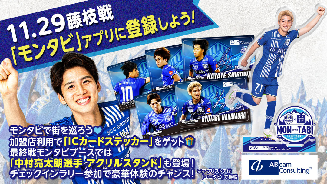 11月29日(土)開催のホーム最終戦藤枝MYFC戦に合わせ、2025シーズンより導入している「モンタビ(ユニタビ)」アプリを用いて、モンタビ加盟店を巡り、街を青に染めるチェックインラリーを開催いたします。