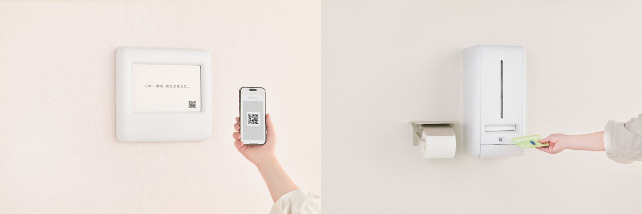 トイレットペーパーと同様に、生理用ナプキンについてもさまざまな施設で無償提供できるようにしたい。そんな想いから本サービスは生まれました。トレルナは、スマートフォンアプリとトイレ内のディスペンサーが連動することで、ナプキンが無料で受け取れるサービスです。トレルナが設置されているトイレ個室に入るとデジタルサイネージにトレルナパートナーの動画が表示され、持続的にサービスを提供できる仕組みとなっています。