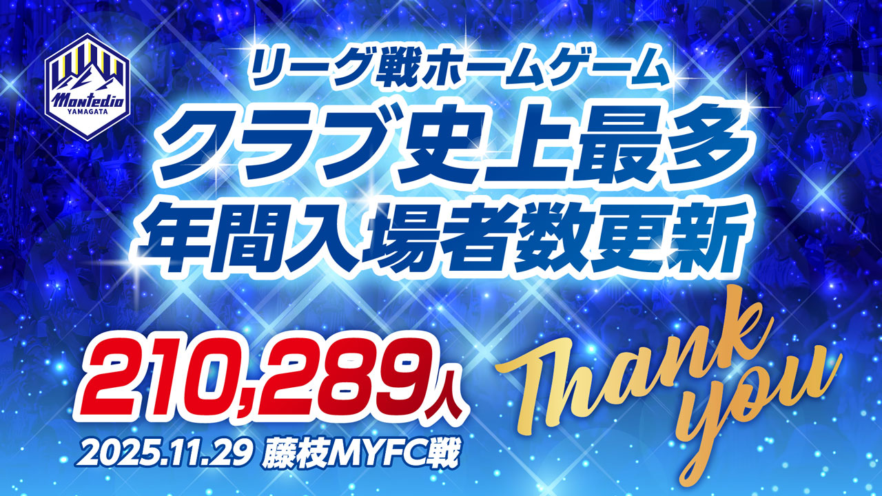 2025年11月29日(土)に行われました2025明治安田J2リーグ 第38節 藤枝MYFC戦での17,261人のご来場をもちまして、今シーズンのリーグ戦ホームゲーム年間入場者数が210,289人(明治安田J2リーグ 19試合)となり、過去最多を記録した2009シーズンの204,953人(Jリーグ ディビジョン1 17試合)を上回り、年間最多入場者数を更新いたしました。