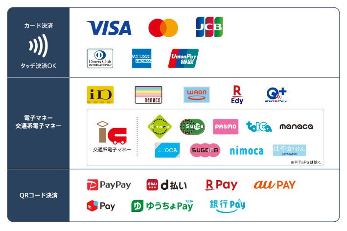 現金・クレジットカード・電子マネー・QRコード決済など、主要27種類の決済が可能です。