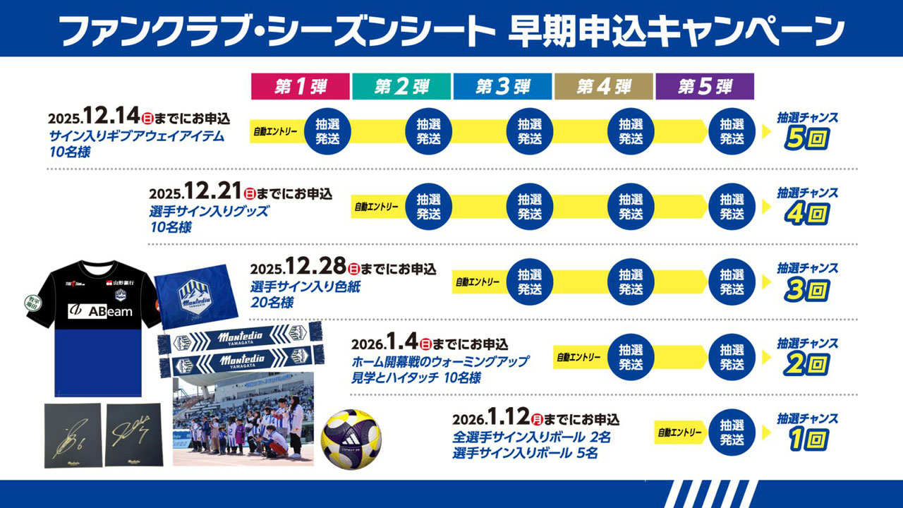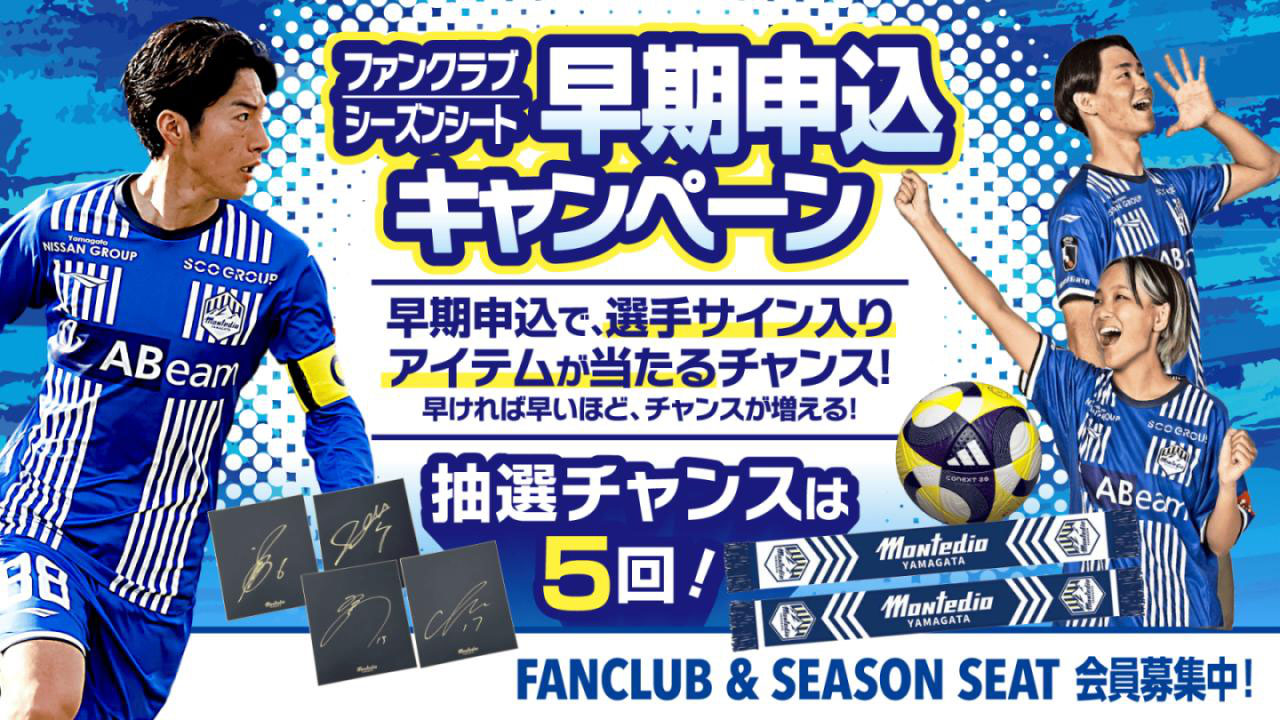 モンテディオ山形では、明治安田百年構想リーグ+2026/27シーズンシート・ファンクラブ早期入会・継続キャンペーンを実施することになりましたのでお知らせいたします。 早ければ早いご入会ほどサイン入りグッズなどが当たるチャンスがUPします! ぜひこの機会にシーズンシート、ファンクラブにご入会ください!