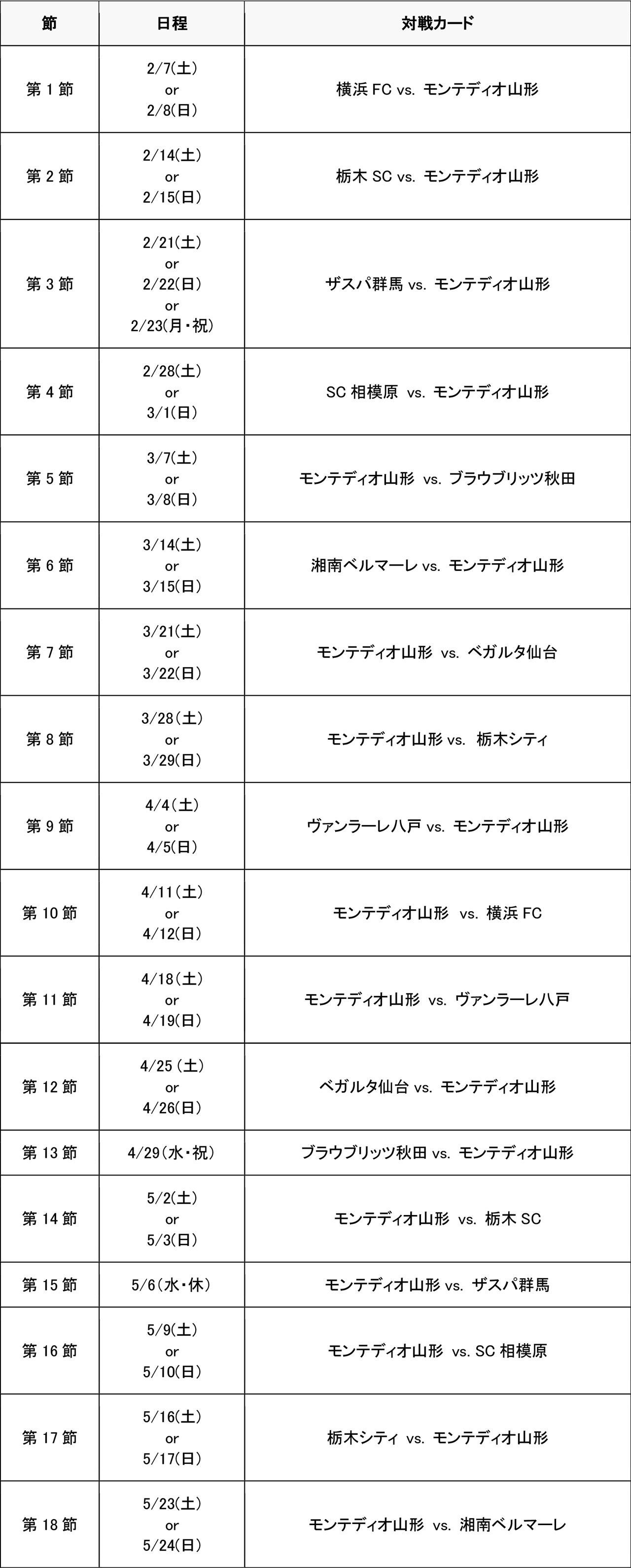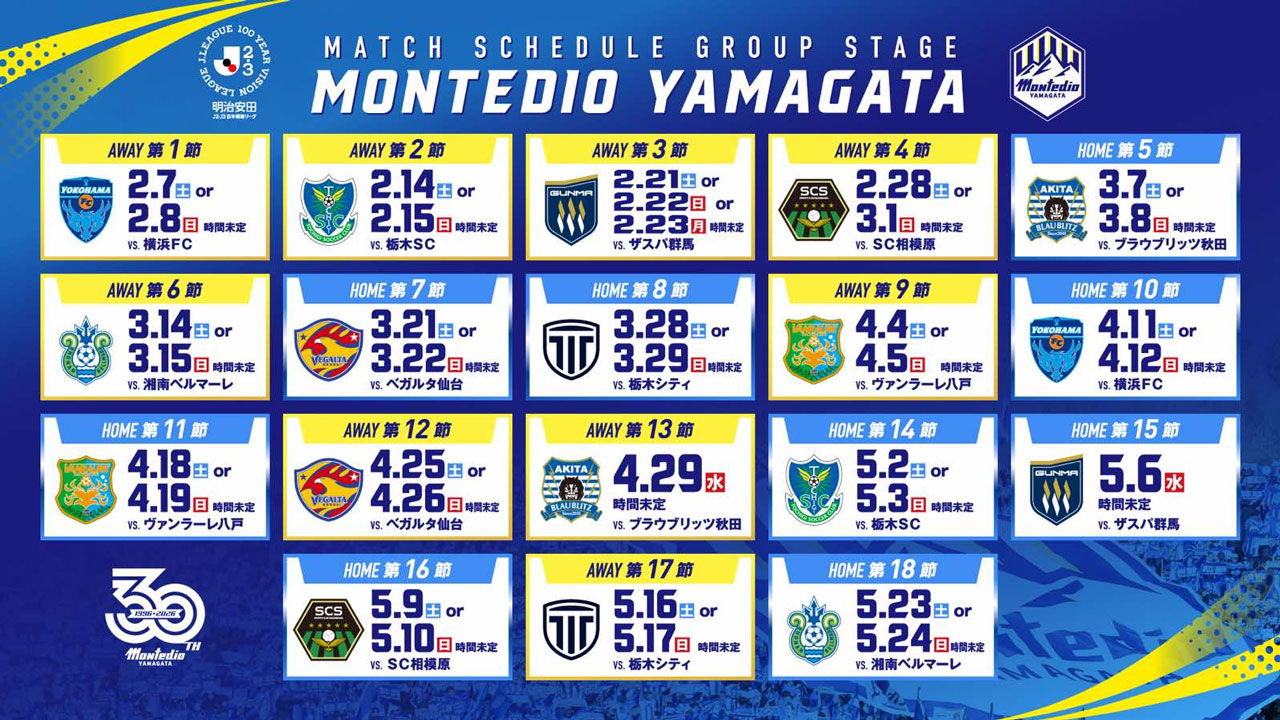 明治安田J2・J3 百年構想リーグ地域リーグラウンド対戦カードが下記の通り決定いたしましたのでお知らせいたします。モンテディオ山形の対戦カードにつきましては以下の通りです。