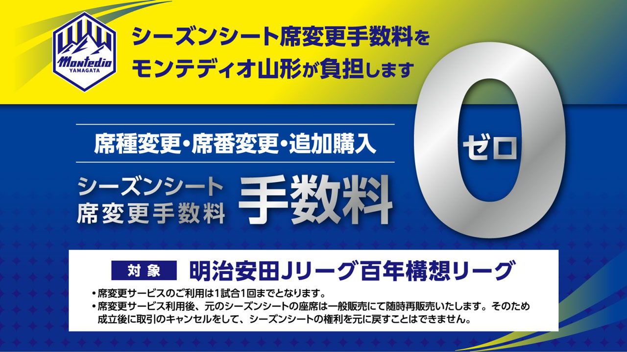 モンテディオ山形は、日頃より熱いご声援をお送りいただいておりますシーズンシートホルダーの皆様を対象に、より快適で自由な観戦体験を提供するため、「席変更サービス」をご利用の際に発生するシステム手数料(220円/席・税込)を、明治安田百年構想リーグ開催試合に限り、クラブが全額負担させていただくことに決定しましたのでお知らせいたします。