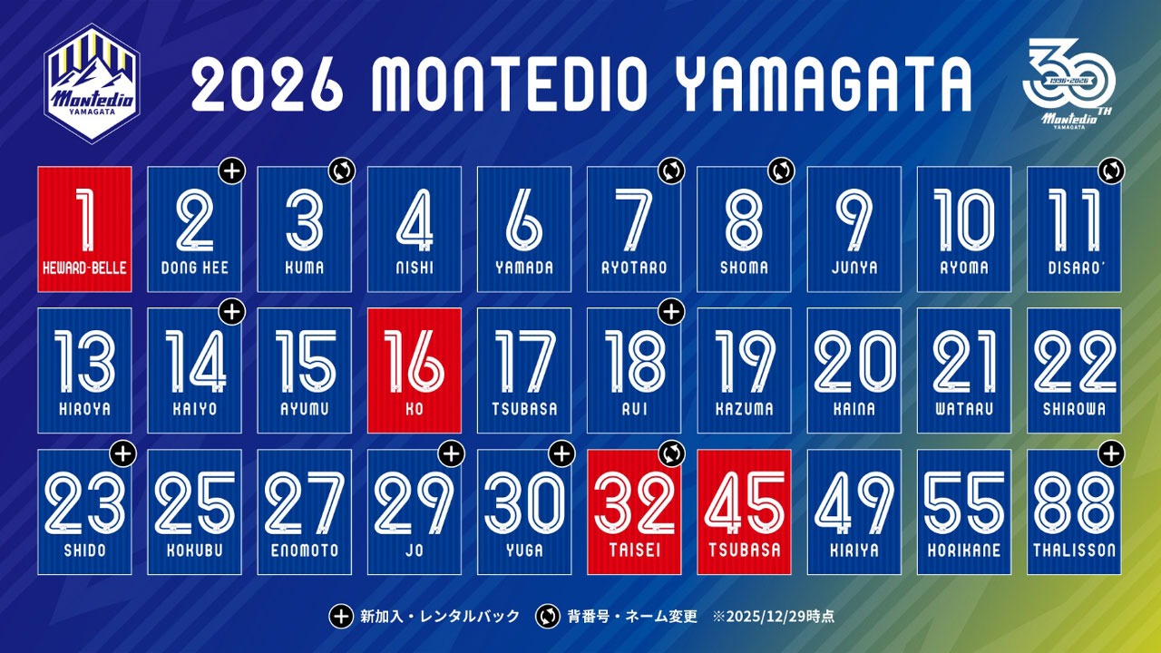 12月25日以降に新加入、加入内定、期限付き移籍期間延長および期限付き移籍からの復帰が決定いたしました5選手の背番号およびユニフォームネームが確定しましたので、下記の通りお知らせいたします。