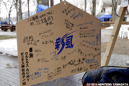 サポーターが中心となり行われた必勝祈願寄せ書き企画の絵馬。皆さんの強い思いがヒシヒシと感じられる寄せ書きがたくさん書かれています。