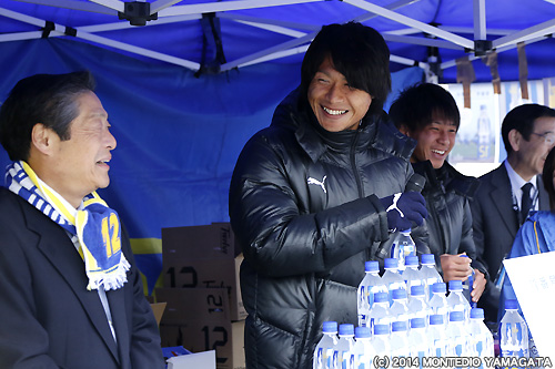 中央広場では、新しく生まれ変わったモンテディオ山形サポート飲料「12(トゥエルブ)」のお披露目が行われます。発売元の山形食品稲村社長様の他、弊社高橋社長、西河翔吾選手と鈴木翼選手、そしてディーオも参加しました。