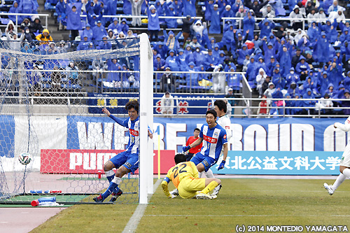 後半の71分、相手エリア正面でフリーキックを得ると、宮阪政樹選手が相手GKの前でバウンドするボールを蹴り込みます。これは阻まれるものの、全力でゴール前に走りこんだ萬代宏樹選手が押し込みゴール!試合展開上、大きな価値を生む得点となります。