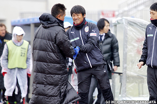 そしてタイムアップ。石崎信弘監督は高橋健二コーチとがっしりと握手します。