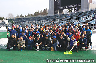 午後の雪かき終了後のみんなで記念撮影!撮影時の合言葉は『J2優勝』。この雪かき同様、これからもサポーターとフロントスタッフが心をひとつにして、ひとつの目標「J2優勝」に向かっていきたいと思います。