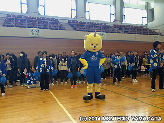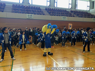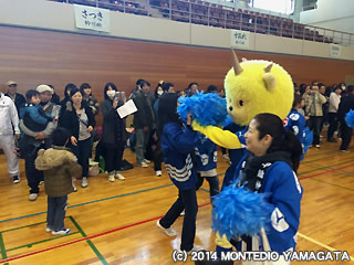 3月1日に天童市のスポーツセンターで行われた、羽陽学園短期大学附属の三つの幼稚園による「三園合同卒園記念体育祭」にディーオが行ってきました。入り口の前で、渡されたボンボンを持って出番を待ちます。