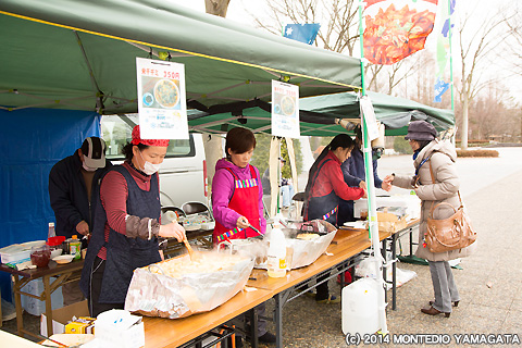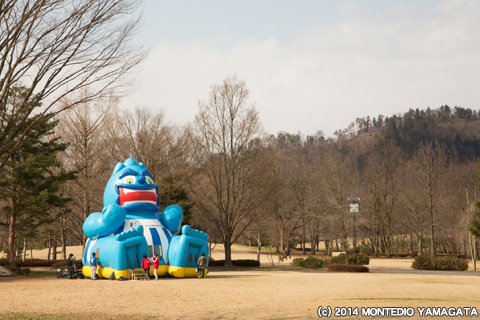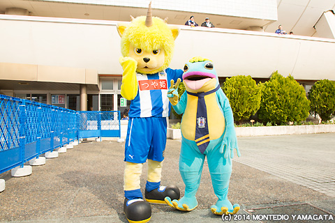対戦相手の愛媛FCのクラブスタッフ「金太」が山形に登場。愛媛FC応援グッズ販売の手伝いや山形サポーターとの交流など雰囲気を盛り上げてくれました。