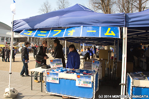 オフィシャルグッズ売店に並んだのは2014年モデルのレプリカユニフォーム。まだナンバー等の取付加工が終わっていないため、取付なしのご予約分だけのお引き渡しとなりましたが、早速新ユニフォームをまとっての応援姿が目につきました。