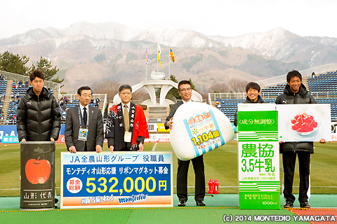 ピッチ内ウォーミングアップの前、様々な面でチームをサポート頂いているJA全農山形グループ様から、リボンマグネット募金とホームゲーム終了後の栄養補給を兼ねた捕食の贈呈を頂きました。