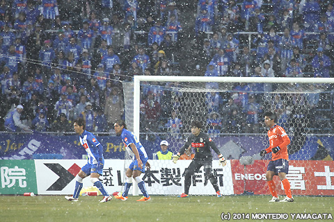 後半途中から予報どおりの雪が降り始める中、ゴールキーパー清水健太選手を中心に集中した守備を見せ、愛媛FCに得点を与えません。