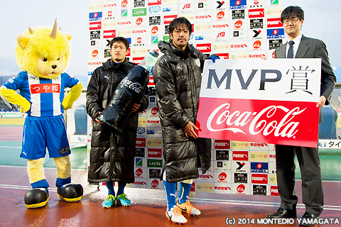 試合後、コカ・コーラ ホームMVP賞に選ばれたのは、1ゴール1アシストの宮阪政樹選手と、1ゴールと無失点に貢献した當間建文選手です。