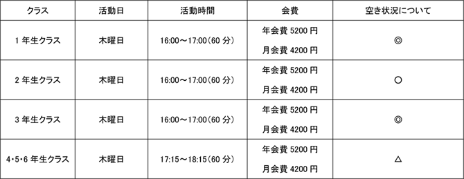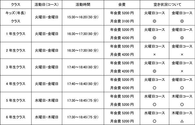 - 週1回の活動となります。天童スクールご希望の方は、年長児~4年生は火曜日か金曜日、5年6年生は水曜日か木曜日をお選びください。