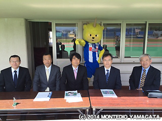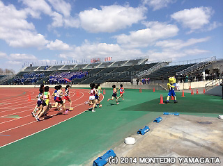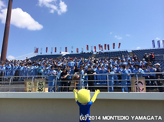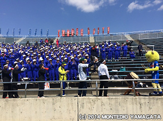 PRしていたら、天童一中、天童二中の生徒たちから、ヤマガタディオ!のコールがありました。ディーオも太鼓を叩いて、盛り上げさせていただきました。