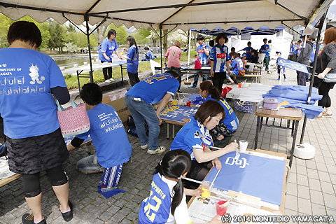 この試合でもゲートフラッグコンテスを開催。スタジアムに来てからも作れると言うことで、みなさん思い思いのゲートフラッグを制作します。