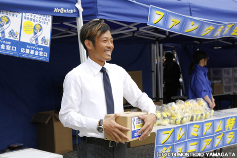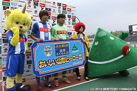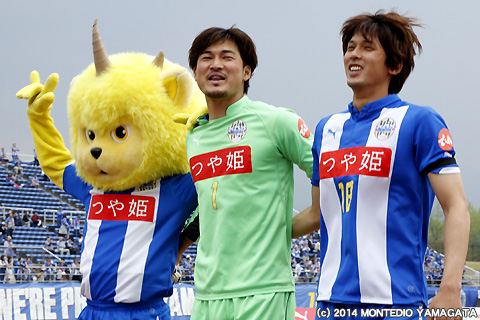 試合後インタビューに呼ばれ「おいしい山形ヒーロー賞」の表彰を受けたのは、ゴールを守り切った清水健太選手とゴールを決めた萬代宏樹選手でした。