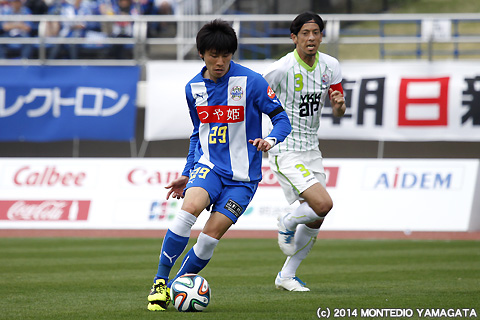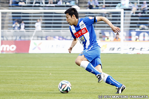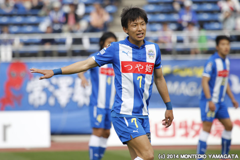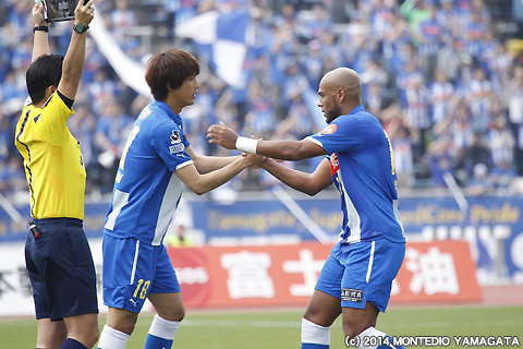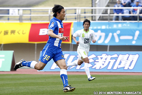 試合は互いにノーゴールのまま後半も時間が進んでいきます。ホームゲームだけに何としても勝利を得たいモンテディオ山形は交代カードとしてフォワードの萬代宏樹選手を投入します。