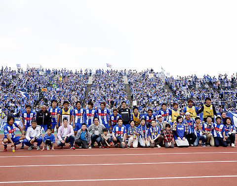 試合後「芝かぶり席」特典グレードアップ企画として、芝かぶり席のお客様と選手との集合写真。90分間の熱いご声援、有難うございました。