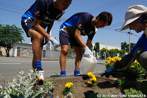 この植裁作業へのモンテディオ山形の協力は昨年よりスタート。今年は初めて選手が参加することになりました。