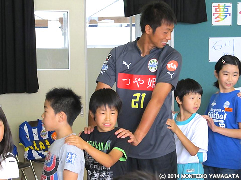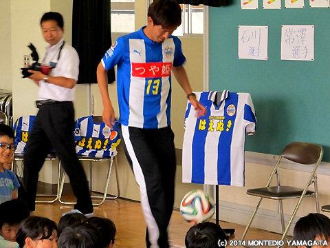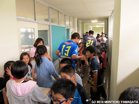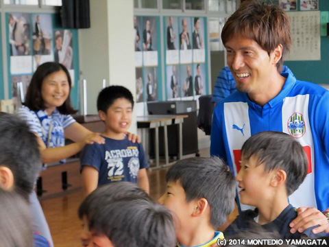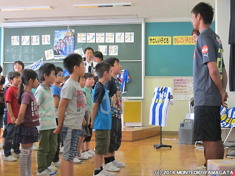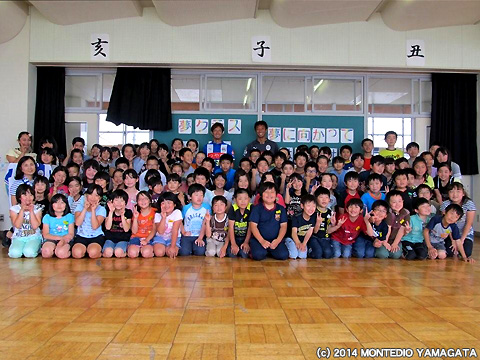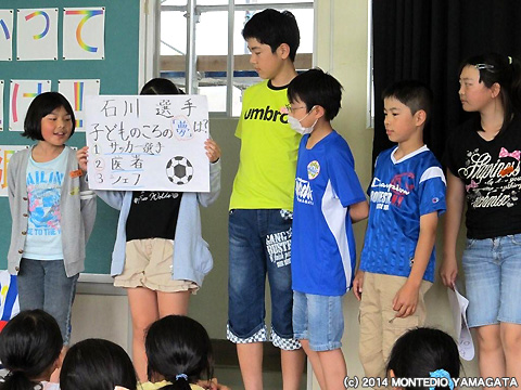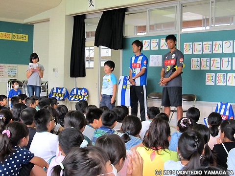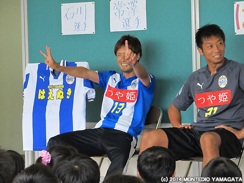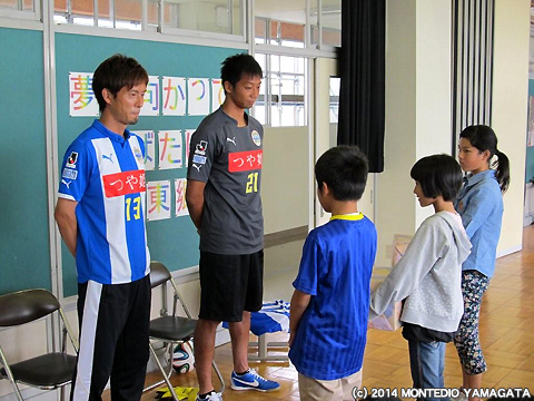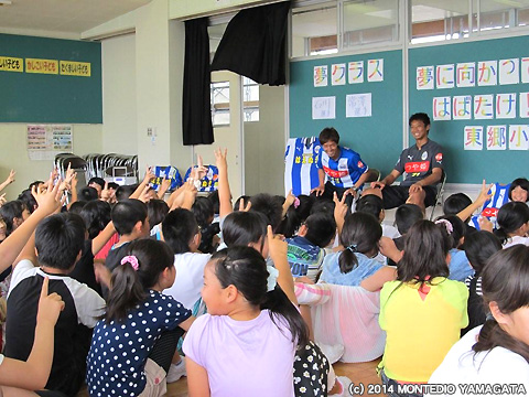 2014年6月11日(水)夢クラスで、石川竜也選手と常澤聡選手が東根市立東郷小学校を訪問しました。夢クラスとは、ホームタウンである山形県内の子どもたちと選手が「夢」について語り合い、選手自身の体験を交えながらアドバイスをおこなう活動です。