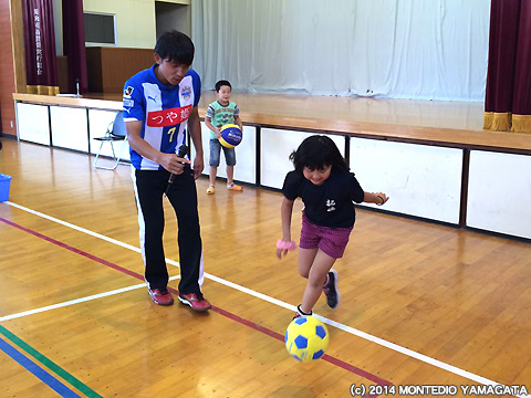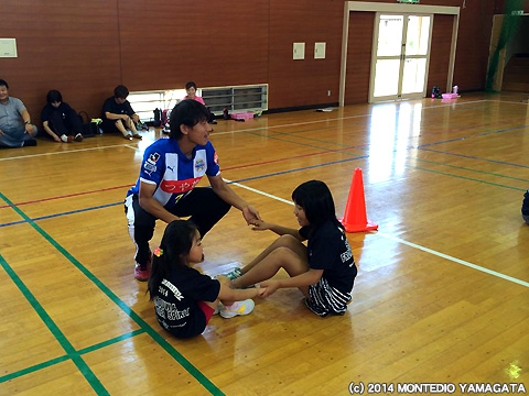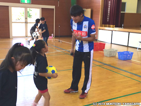 『ボールが落ちても手を使わないでやろう!!』2回リフティングができた女の子には『2回できた!!よし、3回目がんばろう!!』と、持前の明るさ、トークで盛り上げてました。