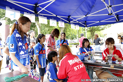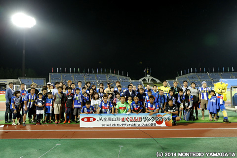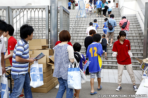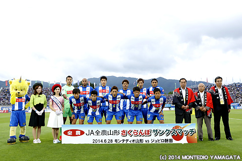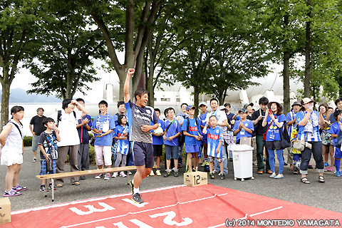 その皆さんにサッカーだけでなく様々に楽しんで頂こうと、この試合のマッチスポンサーを務めて頂いたJA全農山形様の強力なサポートも頂き、目いっぱいのイベントを準備して今日に臨みました。まずはそのJA全農山形様のイベント。試合タイトルの「JA全農山形さくらんぼサンクスマッチ」にもあるように山形自慢のさくらんぼのシーズンということで「さくらんぼ種飛ばし大会」を開催。こちらには常澤聡選手と小林亮選手も参加すると、小林選手は13mを超える記録にこの表情。