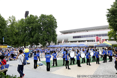 中央広場で行われた「Mountain Ash マーチングバンド」のパフォーマンス。既にたくさんの方がスタジアムに訪れている時間ということで、まさに立錐の余地なし。