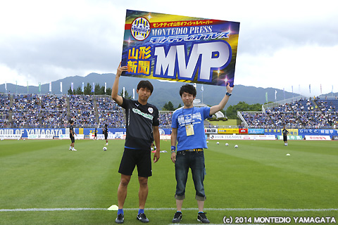 試合前のピッチサイドでは、5月の山新月間MVP賞の表彰が行われます。選ばれたのは、5月全6試合にスタメン出場すると、チームに中盤での守備のバランスと落ち着きを与え、6試合で僅か3失点の堅守の立役者となった松岡亮輔選手です。