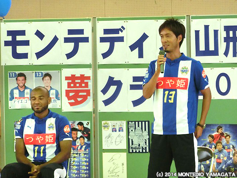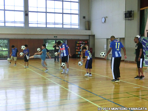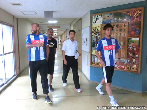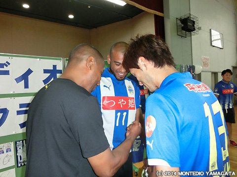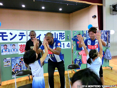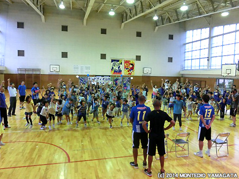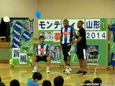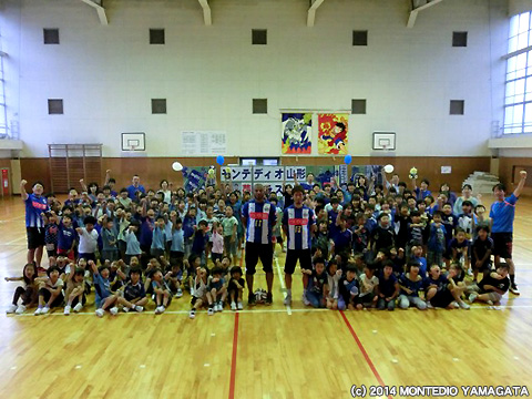 7月9日の夢クラスで、山形8年目のNo.13石川竜也選手と、前半戦7ゴールとチーム最多得点のNo.10ディエゴ選手とダニロマトス通訳が、中山町立豊田小学校に伺ってきました。山形を代表する選手とあってか、全校生徒約140名を対象に体育館での実施となりました。