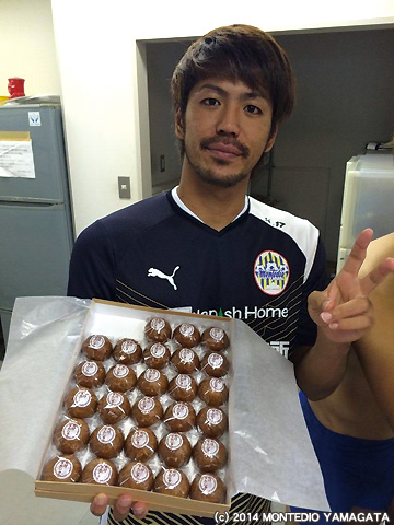 ここでもうひとつ。ひまわり迷路オープニングセレモニーの中で、天童市の一本杉菓子店様より「あげまんじゅう」をチームへ贈呈いただきました。さっそく、選手たちへ渡してきましたよ。