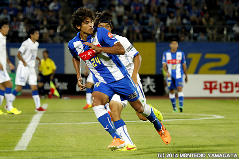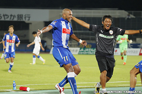 そのディエゴ選手はこの試合ワントップを務め常にゴールを狙い続けると、後半アディショナルタイム、相手ディフェンダーのバックパスを追った山﨑雅人選手と相手ゴールキーパーが交錯したこぼれ球を拾い、試合を決定づける超ロングシュートのゴールを決めました。