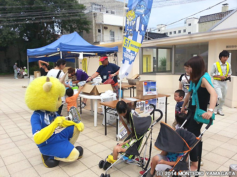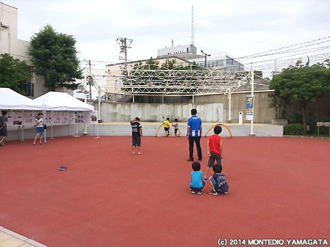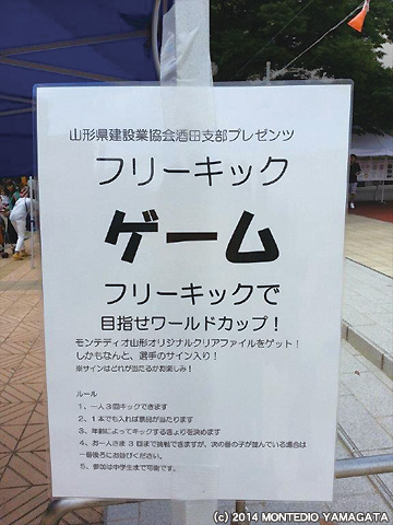 まずは、酒田市中通り縁日祭りでの活動をレポートいたします。縁日祭りでは、今回、山形県建設業協会酒田支部様にご協力いただき、フリーキックゲームが開催されました。