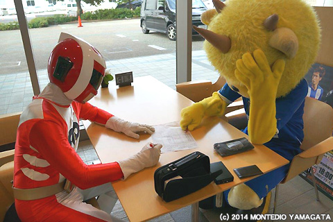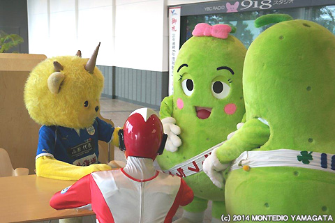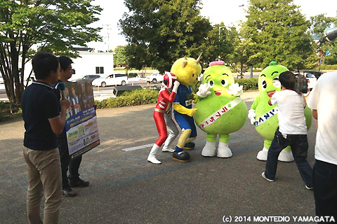 実は今回、ディーオがテレビ出演すると聞き、JA天童からラフちゃん、ランスくん、南陽市からは南陽宣隊アルカディオンのレッドが応援に駆け付けてくれました。
