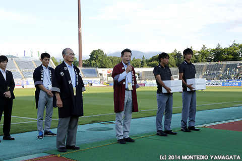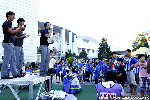 この試合ではモンテディオ山形選手会(会長:山田拓巳選手)の主催による、チャリティーオークションが行われました。これは広島県内で発生した土砂災害に係る義援金と、東日本大震災復興支援のための募金活動のために行われたもので、たくさんのサポーターの皆様にご協力を頂きました。次のホームゲーム・京都サンガF.C.戦(9/20)でも実施致しますので、引き続きご協力のほど、よろしくお願いします。
