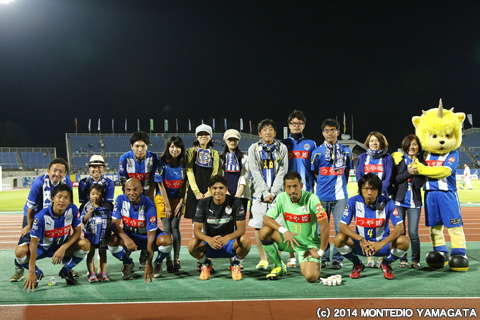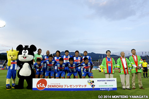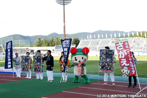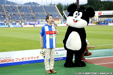 モンテディオ山形サポーターにはすっかりお馴染みの、株式会社でん六の鈴木隆一社長とでんちゃん。この試合ではマッチスポンサーを務めて頂き、イベントへのご協力などでスタジアムを盛り上げて頂きました。