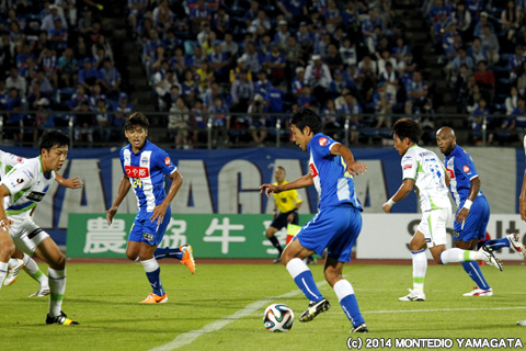 試合開始早々試合は動きます。3分、自陣からディエゴ選手、ロメロフランク選手、中島裕希選手が素早いパスの繋ぎで一気に攻め込むと、最後はディエゴ選手が得意の左足でコースを狙ったミドルシュート。これが見事に決まって先制点とします。