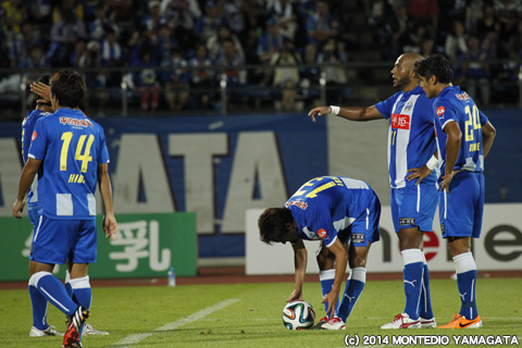 後半思わぬ失点で逆転をされると、モンテディオ山形は同点そして逆転を目指して選手交代を行います。宮阪政樹選手に代わって山﨑雅人選手が出場となると、セットプレーにはディエゴ選手とロメロフランク選手が右足のキッカーのポジションに入ります。