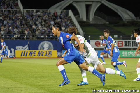 ドリブルで一気に持ち込みチャンスを作る秋葉勝選手。出身の上山市応援デーと言うことで何時にもまして大きな声援を受けます。