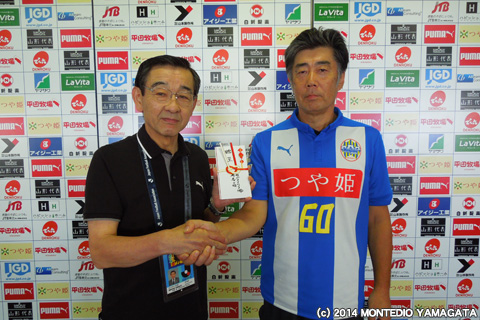 同社のモンテディオ山形サポーター有志の皆様が主体となり、社内で呼びかけていただいた募金です。この日は、有志代表として、板坂寿彦様から弊社高橋節社長に募金贈呈いただきました。